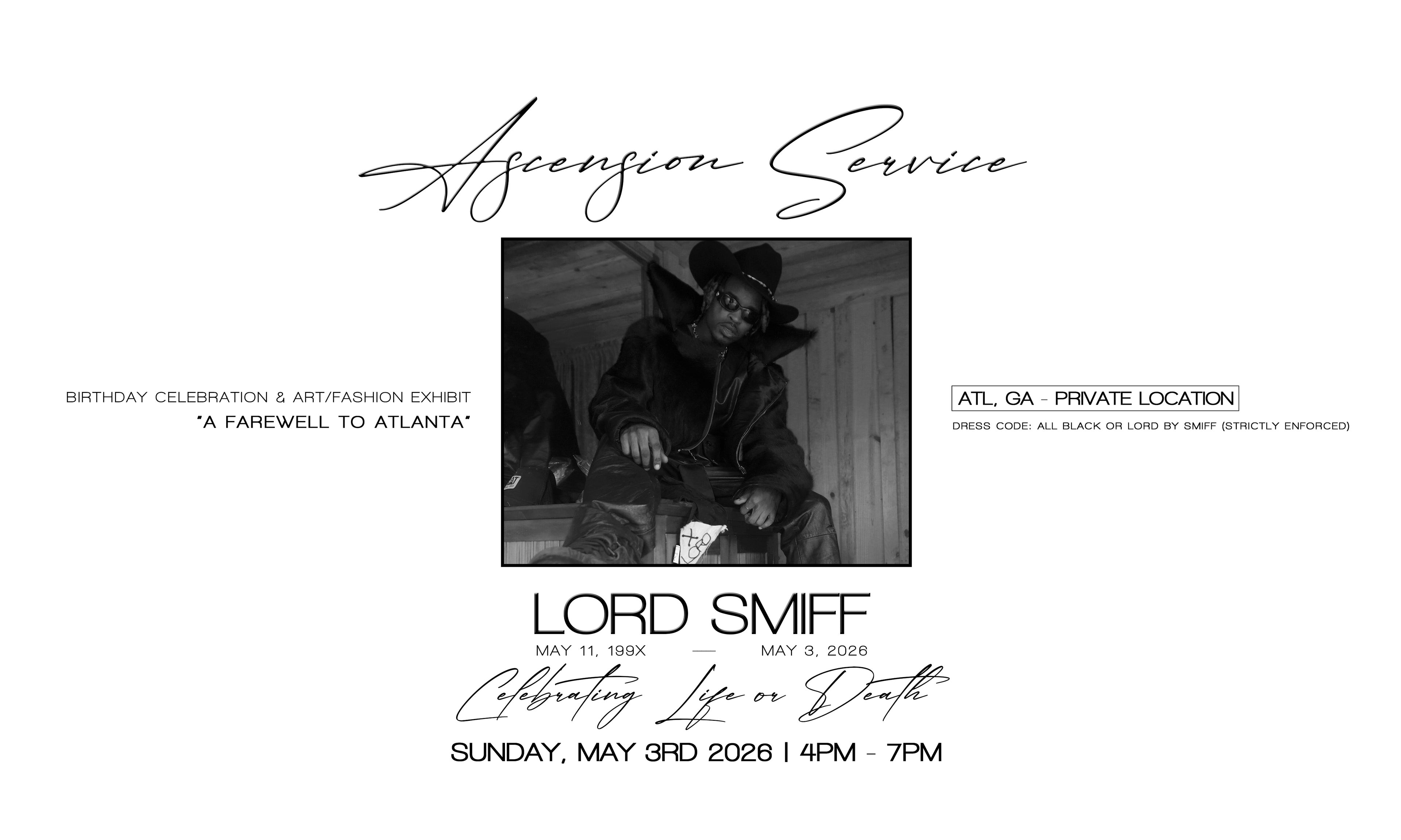 Life or Death: Ascension Service is an offering of preserved works, structural remains, and moments held in suspension. An environment where garments, objects, and presence exist between what was and what follows. An official farewell ceremony for Lord Smiff and celebration of Life or Death.